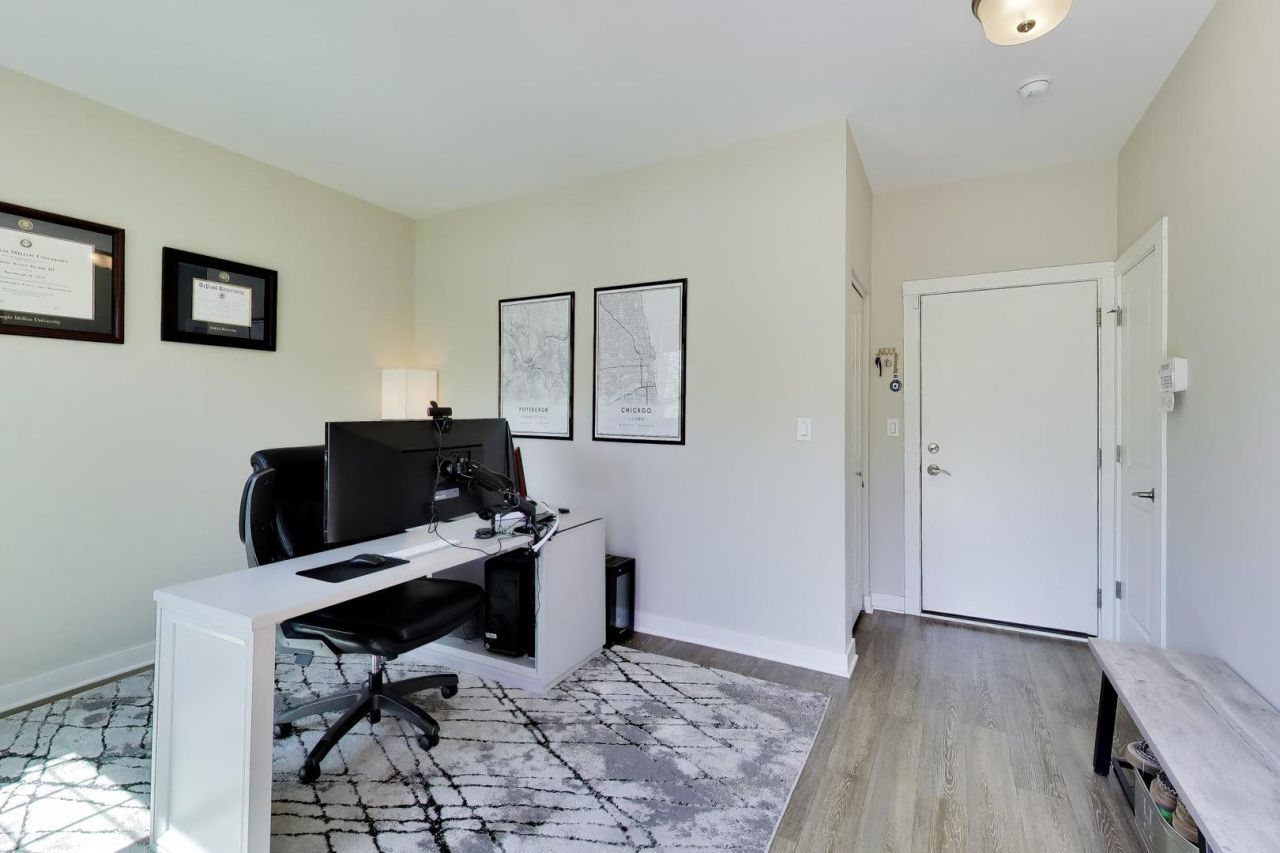 Bright, spacious 2-bed, 2.5 bath townhome in Evanston's Church Street Village (built 2017). Enter from the two-car garage or a welcoming front entry into a flexible main level room ideal for a family room, office, or guest space. The sunny second floor features 9ft ceilings, printed bamboo tongue-and-groove floors, open living and dining areas, and an upgraded kitchen with 42 cabinets, pantry, stainless appliances, Caesarstone counters and backsplash, island with breakfast bar, and a built-in Caesarstone desk, plus a convenient half bath. The third floor, now updated with new hardwood floors and reached by newly refinished hardwood stairs, offers two ensuite bedrooms with large vanities, ample storage, walk-in closets, and a top-floor laundry closet with full size washer/dryer. Whole property freshly painted for a bright, move-in-ready feel. Extras include custom solar shades, geothermal heating/cooling for low utilities, CAT5e/cable wiring, pleasant green space out front, and easy access to Mason Park, schools, downtown Evanston, Lake Michigan, bike trails, Metra, and the CTA Purple Line. Low monthly assessments.